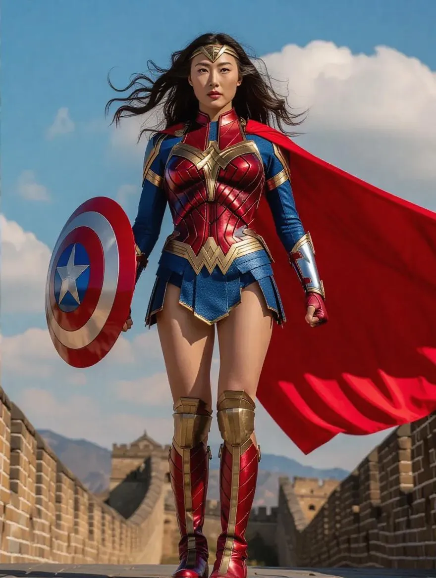 Experience China Supergirl in 4K HDR: AI-generated image of Dada S. in red-blue leotard, shield, and cape, flying cross-legged to save Beijing's Great Wall. Perfect full-body mirror process from afar to close-up. Elevate visuals with Vivago.ai's AI tools for lifelike superhero art, dynamic poses, and cinematic detail.