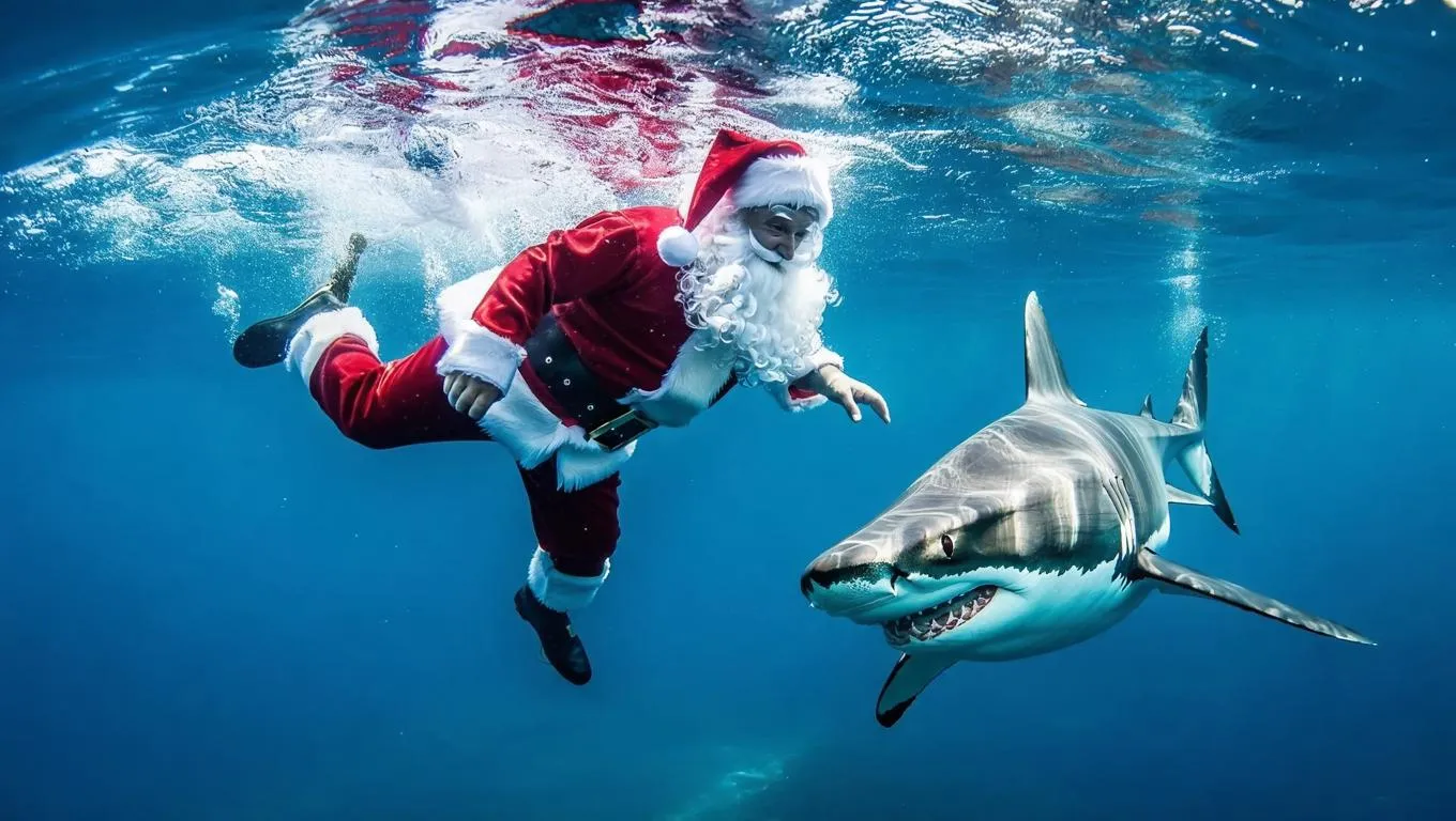 Create a festive AI-generated image of Santa swimming with a shark. Perfect for holiday-themed content, unique visuals, and creative storytelling. Explore vivago.ai's AI image tools to blend humor, fantasy, and Christmas spirit for eye-catching social media or marketing designs.