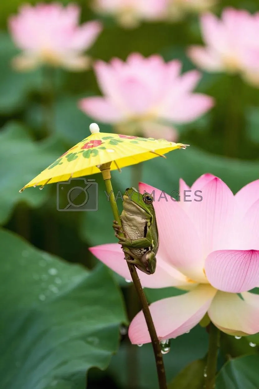 Raindrops from an early summer rain lined up perfectly on this beautiful Lotus, small frog holding a small leaf-umbrella stand-on. The leaf is lemon and green with many more in the background.