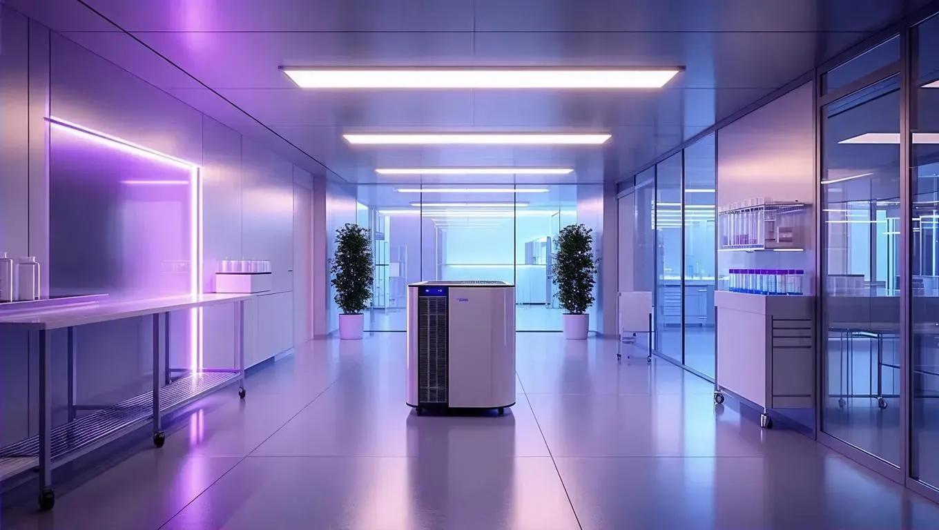 Experience UV-C air purification in action: sterile room illuminated by germicidal rays disintegrating bacteria, viruses, and airborne contaminants. Watch microscopic pathogens vanish under UV-C light, highlighting advanced air sterilization for pristine, safe environments. Ideal for health-focused spaces, this visualization underscores clean air technology’s role in promoting wellness through efficient microbial elimination and contaminant-free atmospheres.