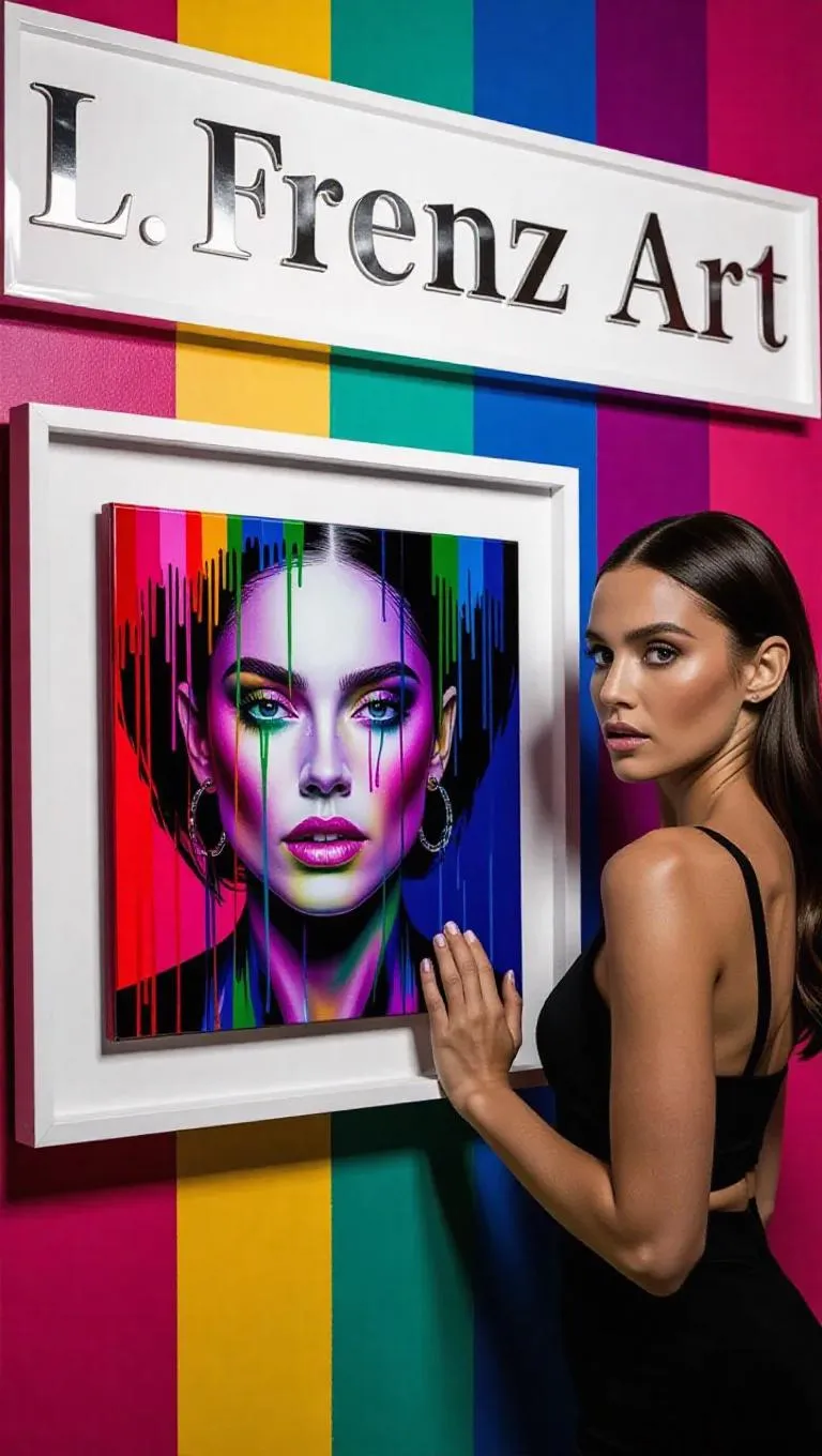 Discover L. Frenz Art AI-generated square paintings with vibrant streaks, sleek white frames, and silver inscriptions. Elevate modern decor with vivid AI art and artistic photography moments featuring top models. Transform spaces using AI tools for contemporary design, creative expression, and gallery-worthy wall displays.