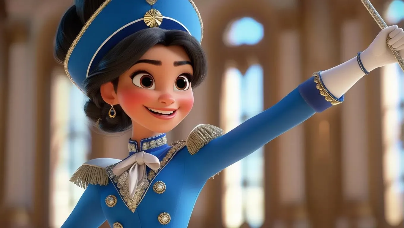 Create vibrant visuals of a Disney-style cartoon girl in an Ecuadorian baton twirler uniform: navy-blue, silver, and white dance costume with mini skirt, knee-high boots, twirling baton featuring wool tassel, and a cheerful ponytail with matching bow. Ideal for AI-generated animations, social media, or themed projects. Perfect vivago.ai tool for dynamic, professional-grade character designs.