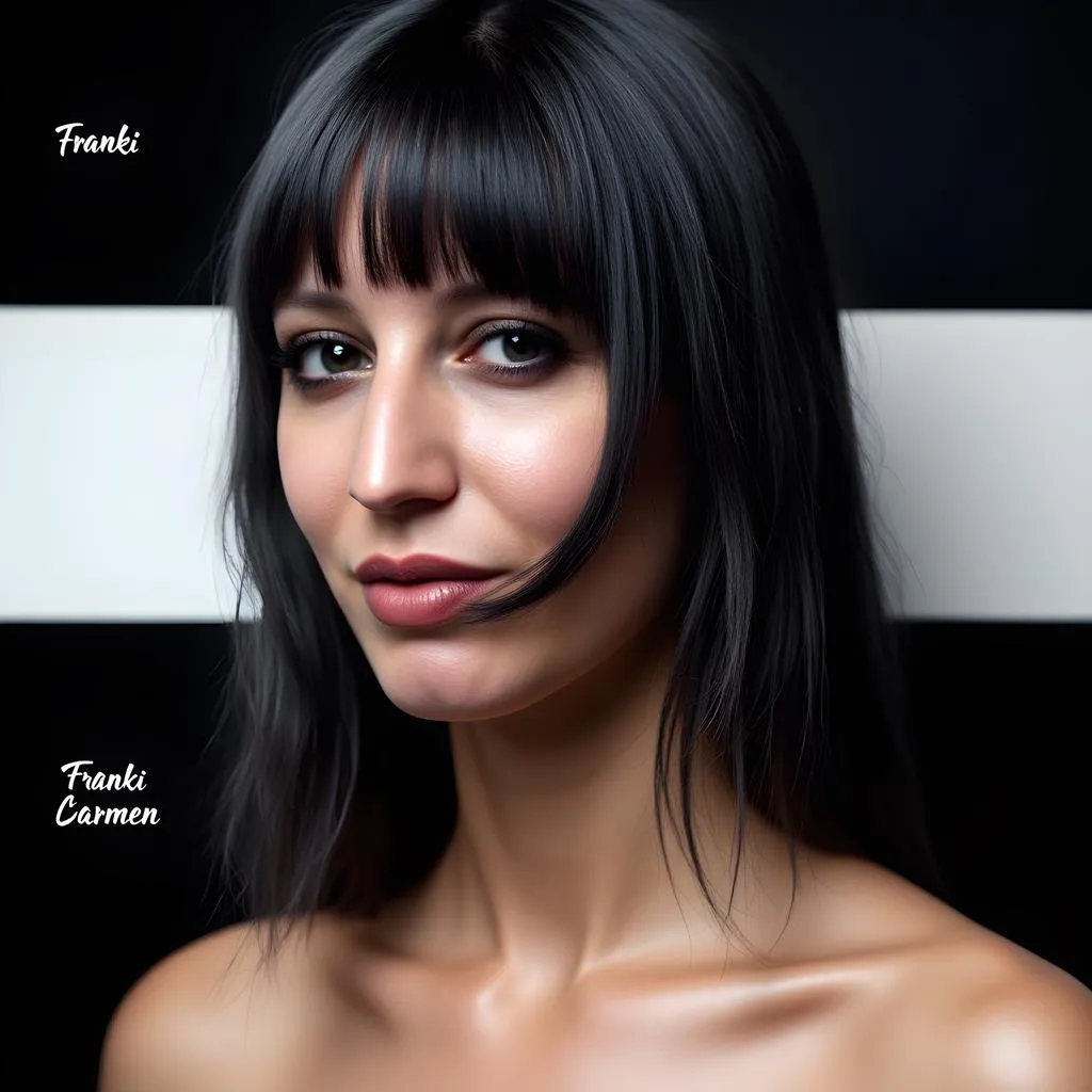 Create a striking AI-generated album cover for "Franki Carmen - Stripped" featuring a close-up of a woman with long black hair, side-swept bangs, and bare neck against a black background. Ultra HD quality enhances dramatic facial focus and smug expression. Perfect for musicians seeking edgy, professional visuals through AI-powered creative tools.
