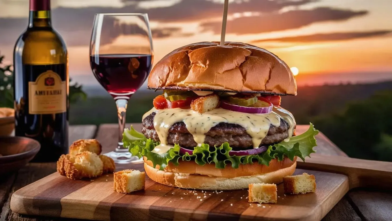 Craft the ultimate homemade giant hamburger with a golden, savory crust, drizzled in zesty Caesar dressing. Featuring fresh romaine lettuce, crunchy croutons, and melt-in-your-mouth perfection, this AI-generated scene captures warm, inviting food photography. Ideal for gourmet recipes, social media visuals, or foodie inspiration. Elevate your culinary creativity with Vivgo.ai's AI-powered tools for stunning, professional-grade imagery.