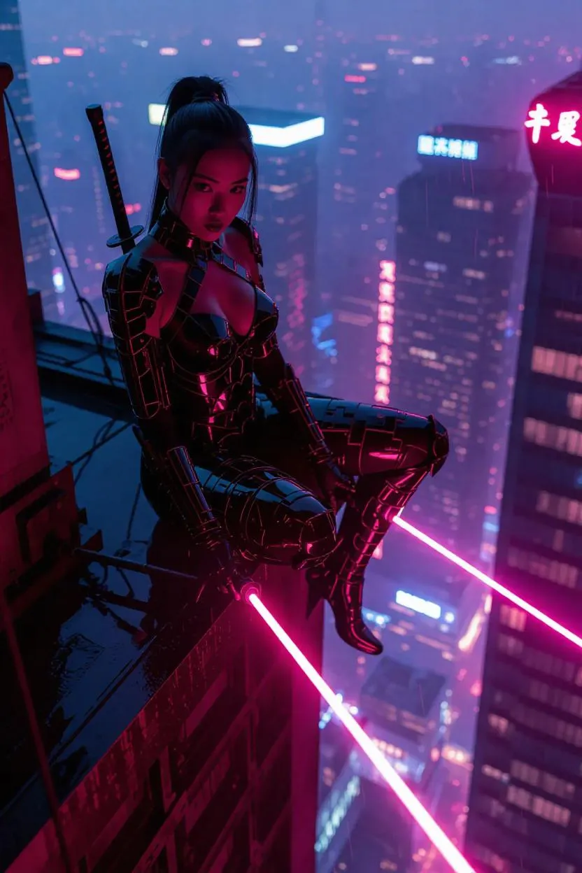 Cyberpunk Mulan perches atop a neon-drenched skyscraper's edge, crimson prosthetics gleaming as rain sheets across her black armored halter, segmented plates mimicking overlapping oni masks. Carbon-fiber combat pants fuse to hydraulic knee boots, plasma-edged pyro-katanas sizzle through monsoon rains. Holographic neon dragons from the Red Lotus arcology cast rippling reflections on her razor-edged undercut and glowing hanzi tattoos. Below, matte-black security drones with yin-yang optics ascend through smog, chainblades sparking against her crossed energy blades, while augmented tiger drones roar from neon-lit alley markets.
