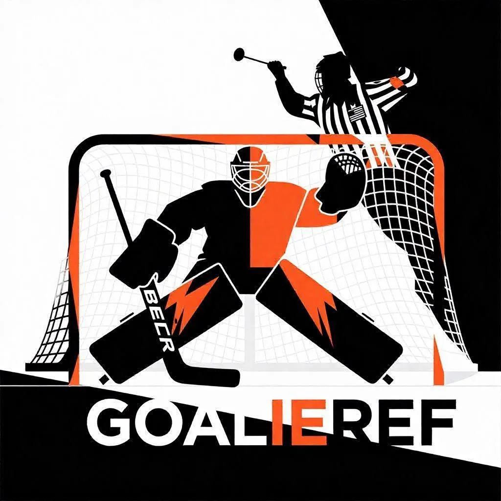 Create AI-generated minimalist hockey art with dynamic goalkeeper and referee silhouettes in negative space. Sleek ice hockey goal net design features abstract shapes, crisp lighting, and bold red/orange accents. Modern abstract style blends sharp lines with clean finishes for striking sports visuals. Ideal for logos, merch, or digital content with contemporary aesthetic.