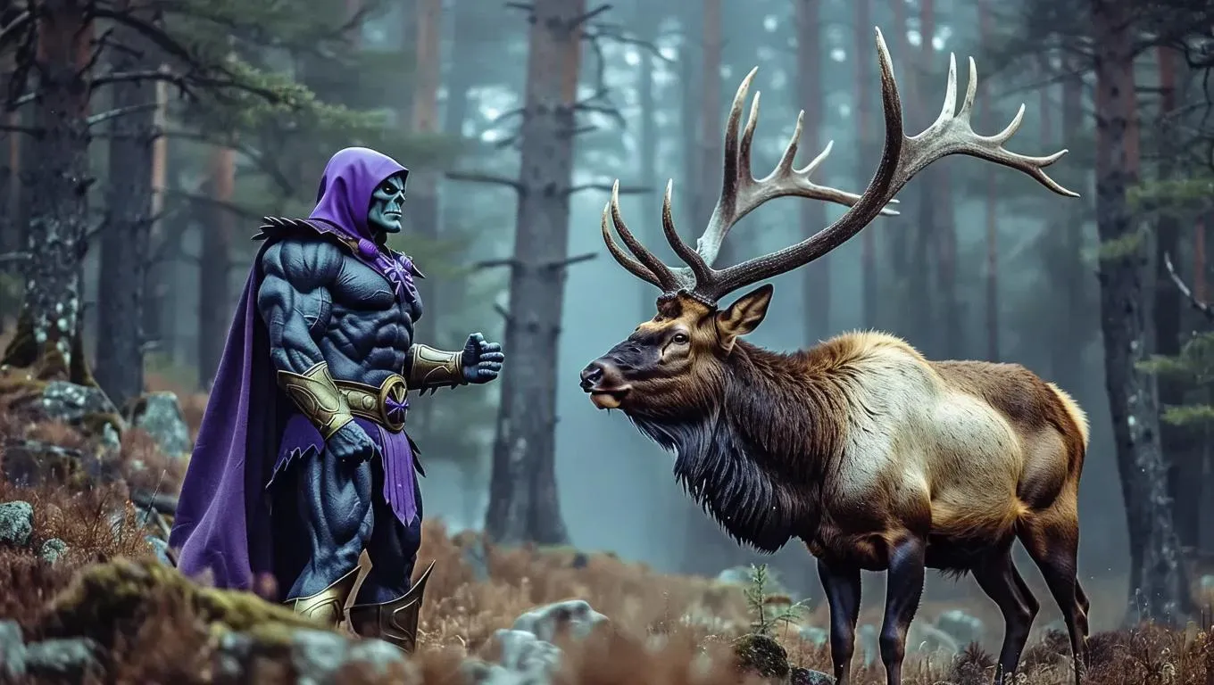 Generate an AI-powered image of Skeletor terrified by a majestic elk, blending fantasy and humor. Explore Vivago.ai's tools for surreal AI art, transforming text prompts into vivid visuals with effects. Perfect for meme-worthy mashups, villain vs. wildlife scenes, and creative storytelling.