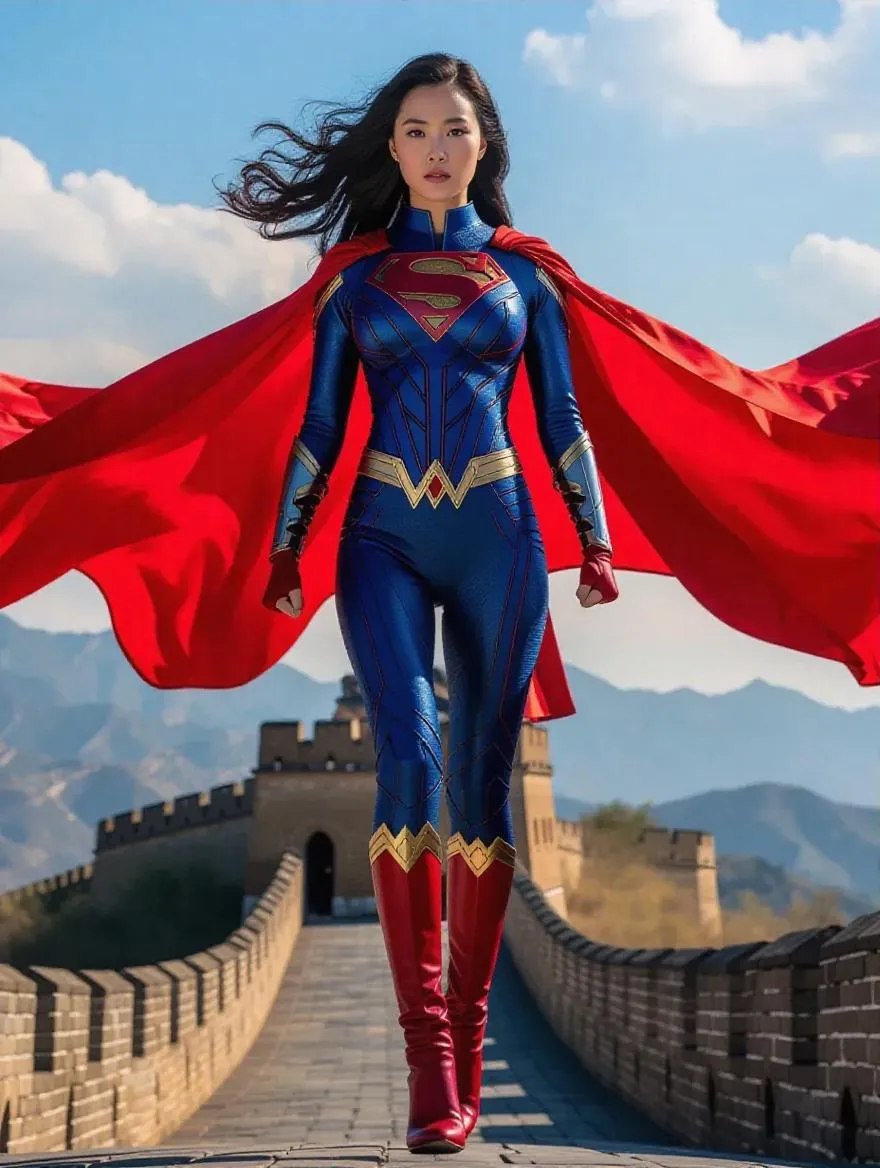 Experience China Supergirl in 4K HDR: AI-generated image of Dada S. in red-blue leotard, shield, and cape, flying cross-legged to save Beijing's Great Wall. Perfect full-body mirror process from afar to close-up. Elevate visuals with Vivago.ai's AI tools for lifelike superhero art, dynamic poses, and cinematic detail.