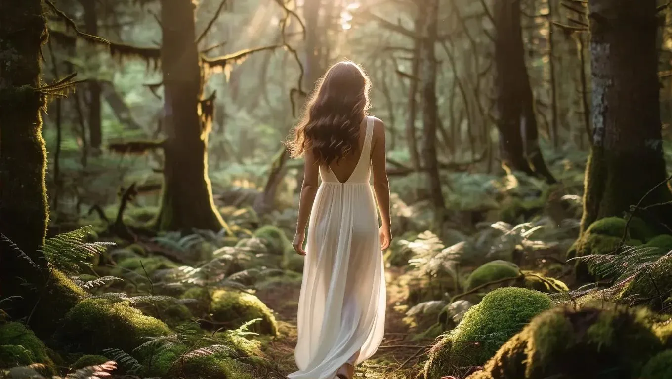 Generate a realistic woman in a minimalist white dress with brown wavy hair, walking through an enchanted forest. AI image tools enhance lifelike details, textures, and natural ambiance. Perfect for fantasy art, storytelling, or nature-inspired visuals. Explore AI effects for seamless blending of realism and ethereal style.