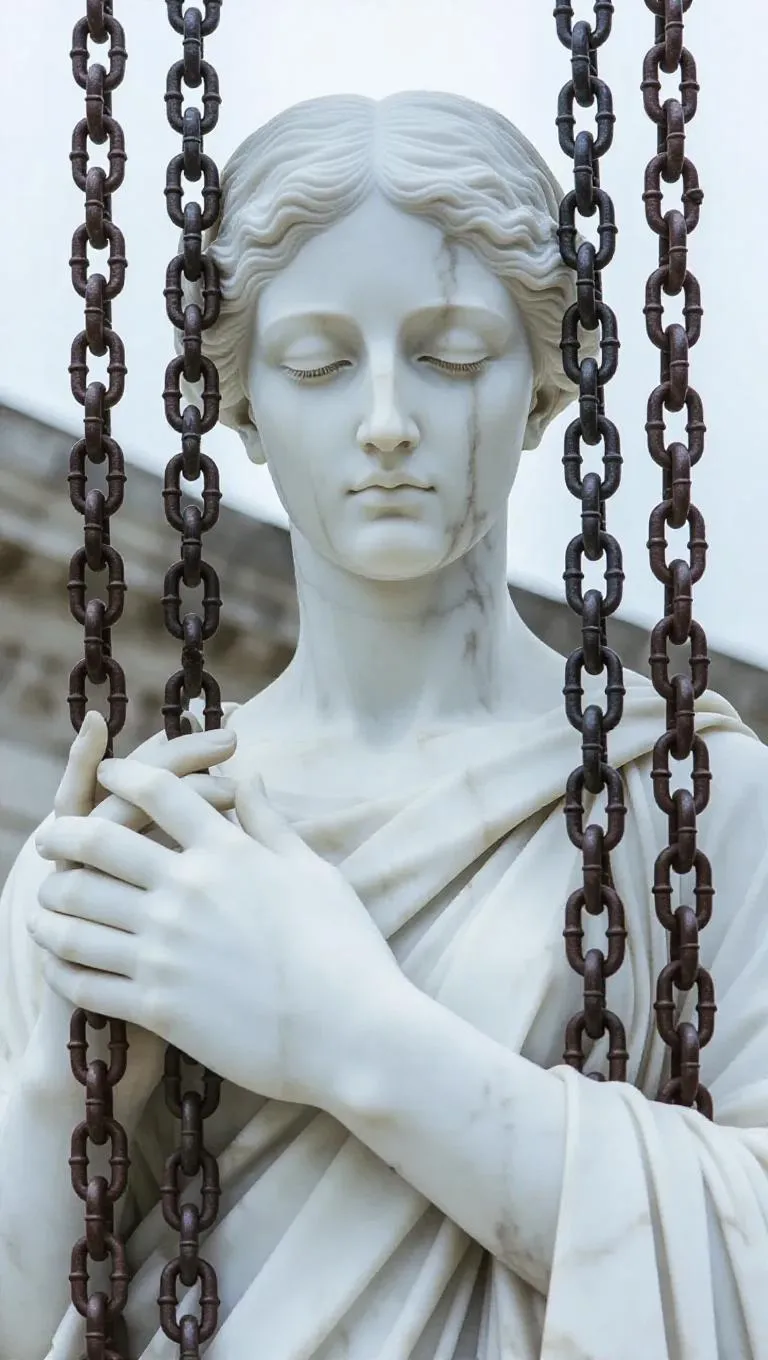 Marble statues draped in heavy, rusted chains, set against a somber, overcast sky, with intricate details in the stone faces and hands, creating a hauntingly beautiful contrast between the cold, lifeless marble and the oppressive weight of the chains.