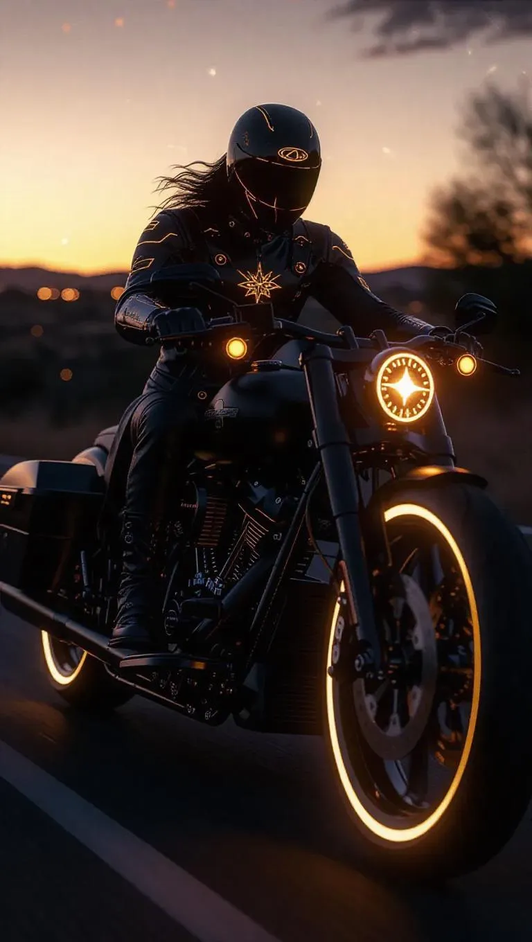 Divine AI-generated art of Metatron cruising a futuristic matte-black motorcycle with glowing inscriptions. Hyper-realistic 4K visuals capture serene twilight highway rides, blending celestial symbols, tactical gear, and divine intellect. Elevate creative projects with Vivago.ai's AI image generation for celestial aesthetics and cutting-edge design.