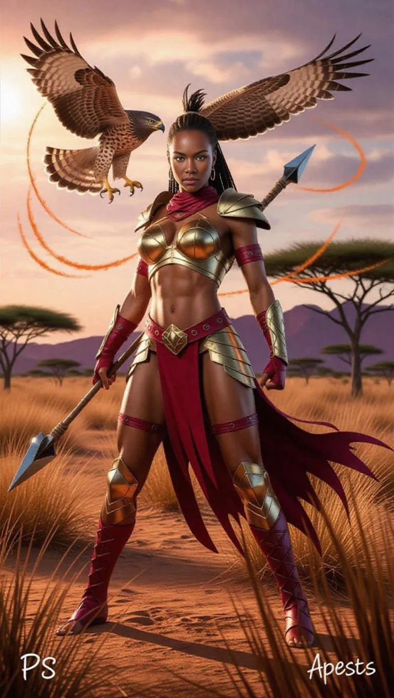 Vibrant AI-generated art depicting a powerful African warrior queen on sunlit savanna, wearing golden armor with crimson leather accents. Dynamic illustration features majestic hawk companion, obsidian-tipped spear, and intricate tribal patterns. Radiates strength through amber-lit grasslands, acacia trees, and violet mountains – perfect blend of battle-ready elegance and AI-enhanced digital artistry for visual storytelling.