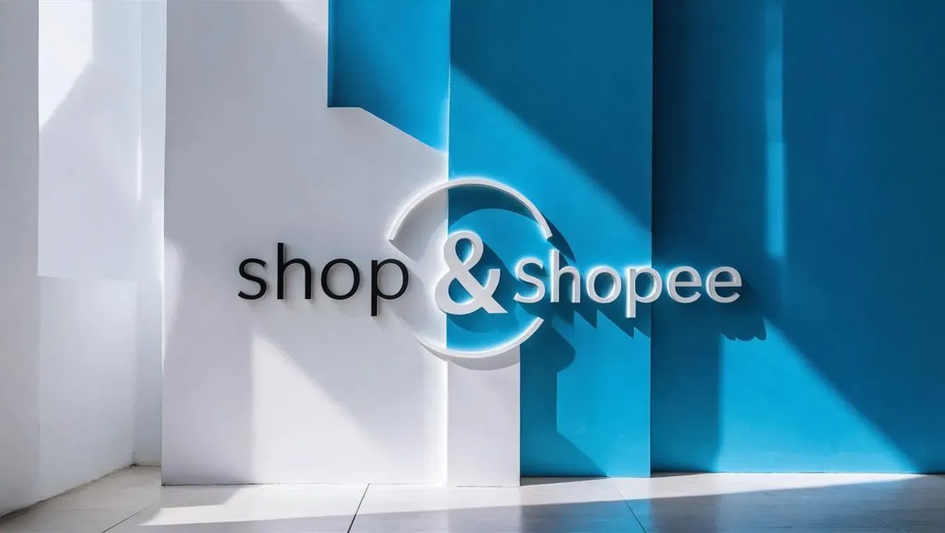 Create a sleek, minimalistic "Shop & Shopee" logo with ad hoc blue and white hues on a crisp white background. High-resolution 4K quality ensures sharp details and modern aesthetics, ideal for branding and digital platforms.