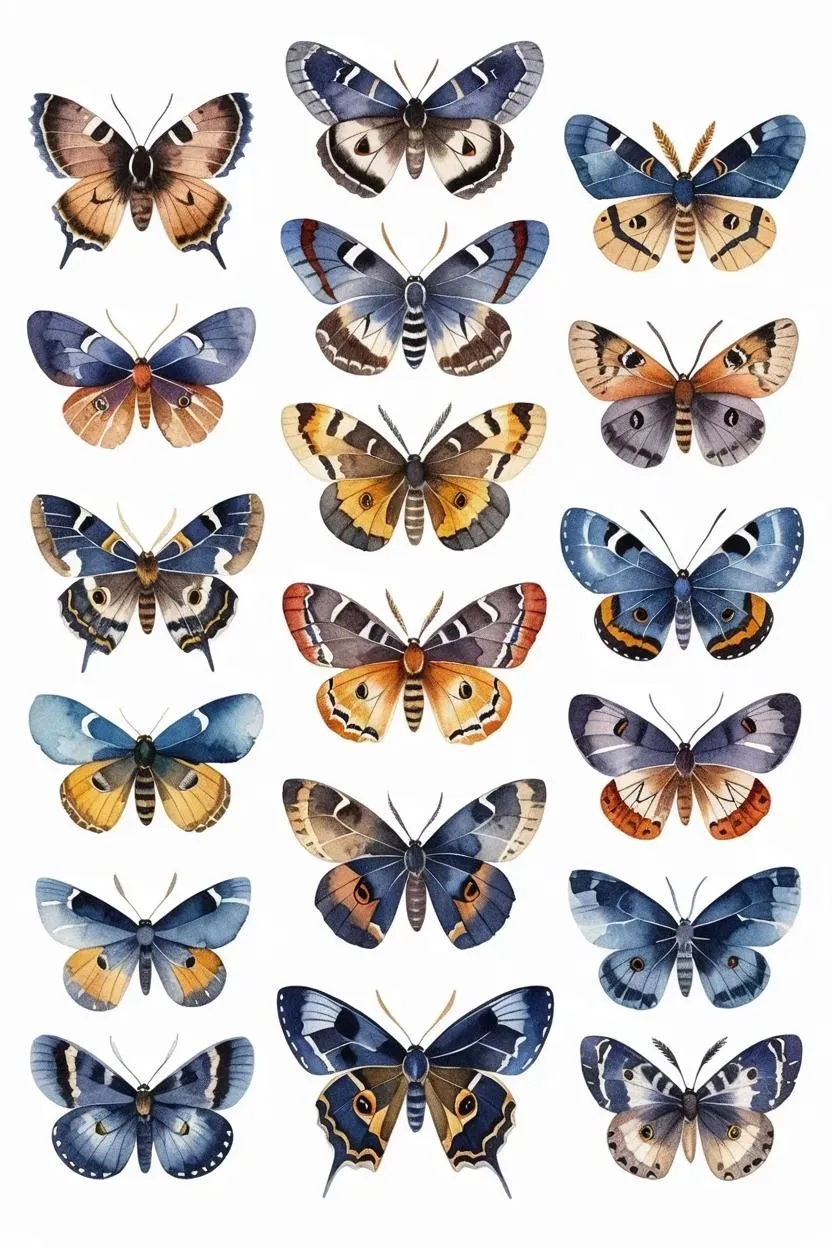 Create AI-generated nocturnal moth sticker sheets with vivago.ai's watercolor effect. Design rows of detailed, non-overlapping moths on a white background using text prompts. Perfect for artistic projects, nature-inspired designs, or printable sticker collections with professional AI editing tools.