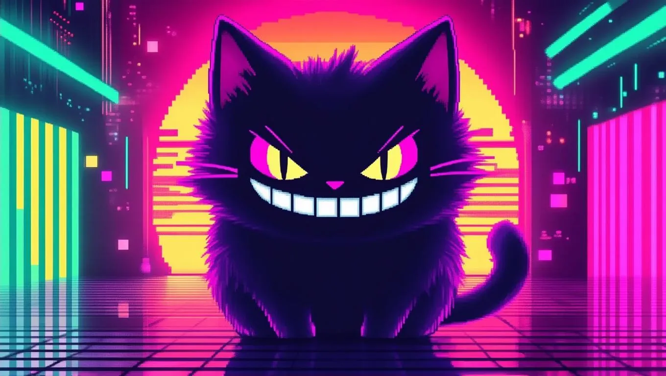 Create a nostalgic AI-generated creature blending Gengar's iconic Pokémon face with Felix the Cat's playful body, set in a vibrant 80s retro-themed backdrop. Perfect for fans seeking unique, retro-inspired character mashups, crafted with cutting-edge AI art tools for dynamic, eye-catching visuals.