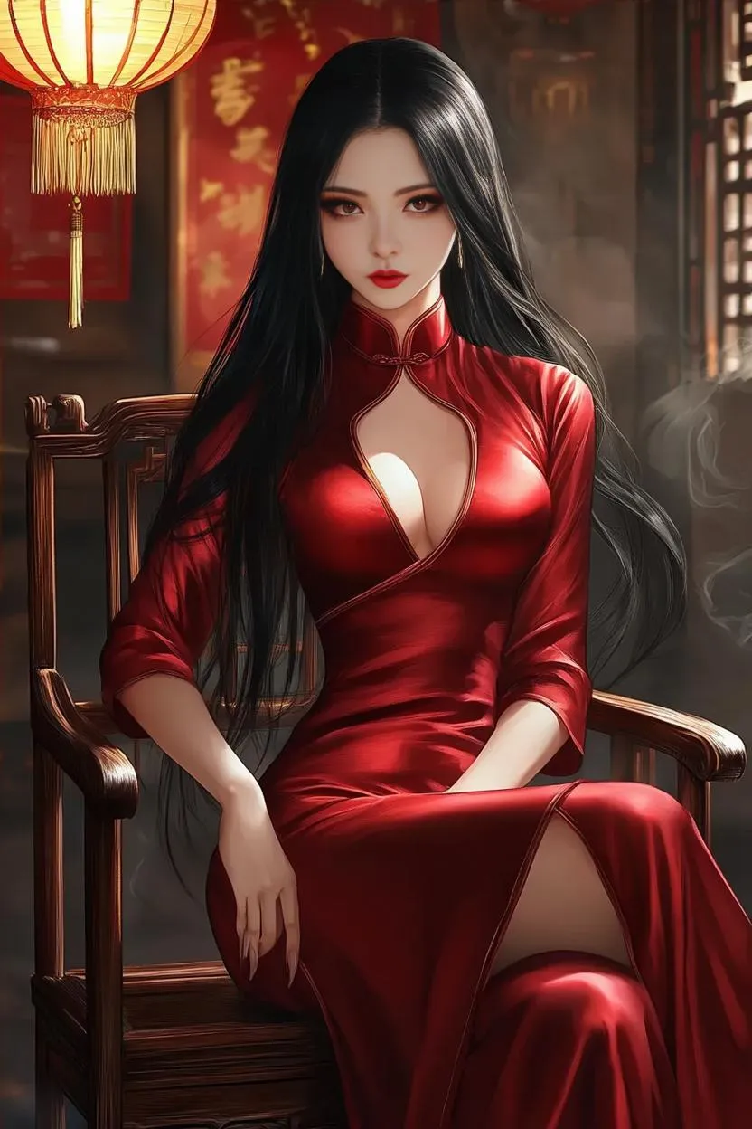 Create a vivid anime scene with vivago.ai: AI-generated image of a seductive woman in crimson cheongsam, seated on antique chair under dim lanterns. Craft smoky tea house ambiance with gold accents, flowing silk, and dramatic lighting. Transform text to stunning AI art for professional anime visuals, effects, and atmospheric storytelling.