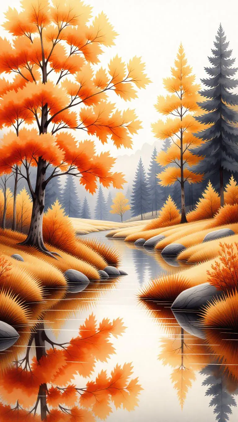 Create a stunning AI-generated watercolor painting of a vibrant autumn scene with a loose hand-drawn style. Featuring warm orange, yellow, and brown hues, intricate details, a serene stream, and cozy atmosphere for peaceful tranquility. Perfect for AI art lovers seeking professional-grade, vibrant, and serene seasonal visuals.