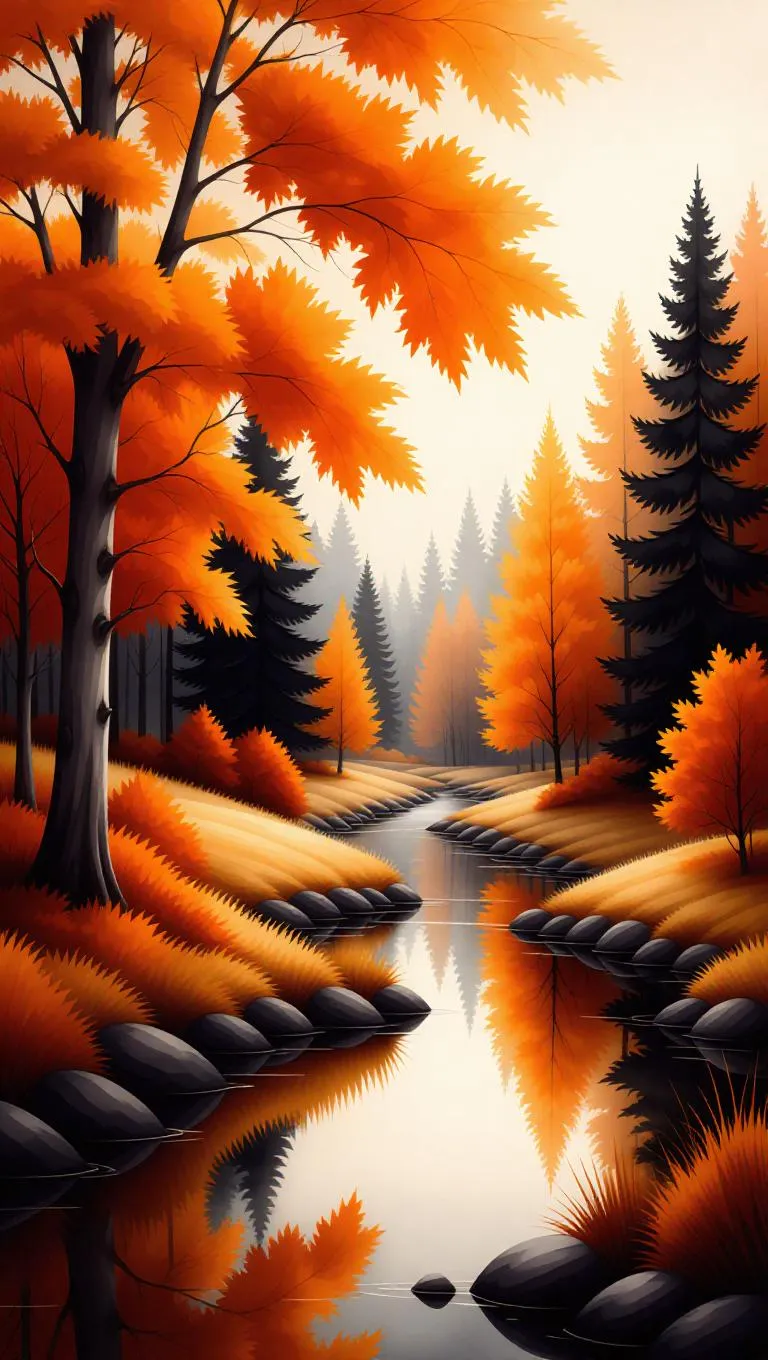 Create a stunning AI-generated watercolor painting of a vibrant autumn scene with a loose hand-drawn style. Featuring warm orange, yellow, and brown hues, intricate details, a serene stream, and cozy atmosphere for peaceful tranquility. Perfect for AI art lovers seeking professional-grade, vibrant, and serene seasonal visuals.