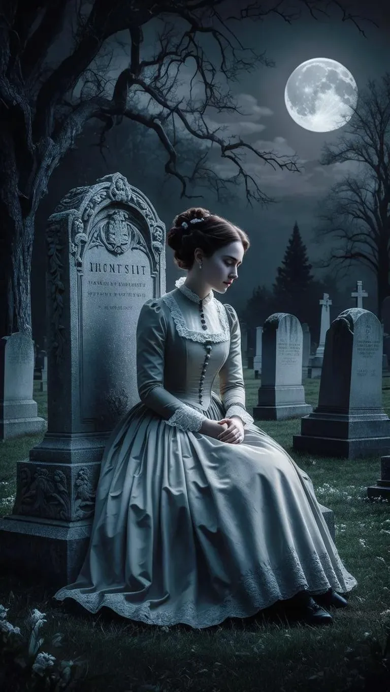Step into a haunting gothic scene where a Victorian-era woman sits pensively on a weathered tombstone, surrounded by eerie cemetery shadows, gnarled trees, and a haunting full moon. AI-generated effects amplify the dark ambiance, blending mystery and melancholy for captivating visual storytelling. Perfect for creating atmospheric, AI-powered gothic art.