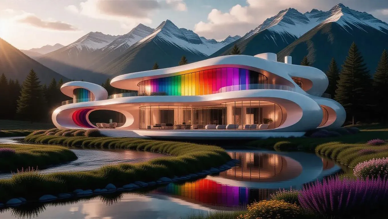 Discover AI-generated luxury with this serene, modern white futuristic house glowing in rainbow hues. Minimalist design meets nature’s grandeur: glass windows reflect rivers, mountains, and golden sunset magic. Elevate creativity with Vivago.ai’s tools for awe-inspiring, harmonious visuals blending sleek architecture and tranquil landscapes. Perfect for visionary art, ads, or immersive storytelling.