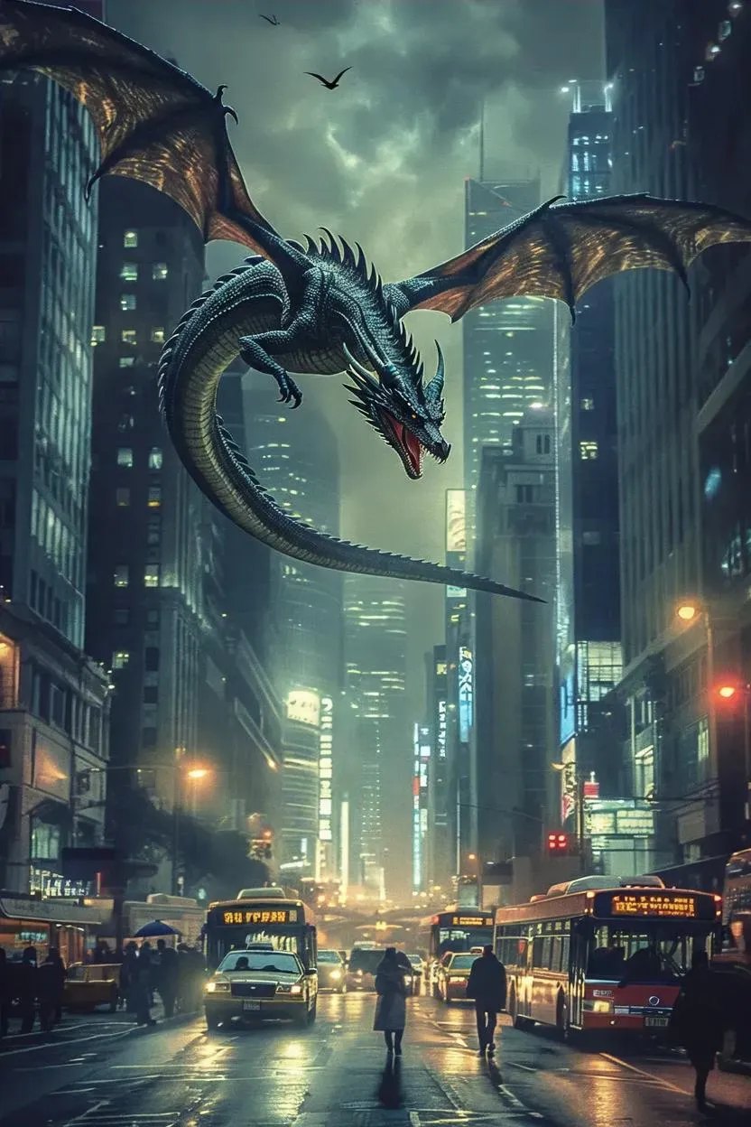 Vivago.ai crafts AI-generated visuals of a serpentine dragon menacing a vibrant '80s cityscape. Transform text into retro-futuristic scenes with skyscrapers, chaotic streets, and oblivious crowds under the dragon’s gaze. Unleash cinematic AI effects and editing tools for cool, vintage-inspired movie covers. Professional-grade results merge mythical creatures with neon-lit urban chaos.