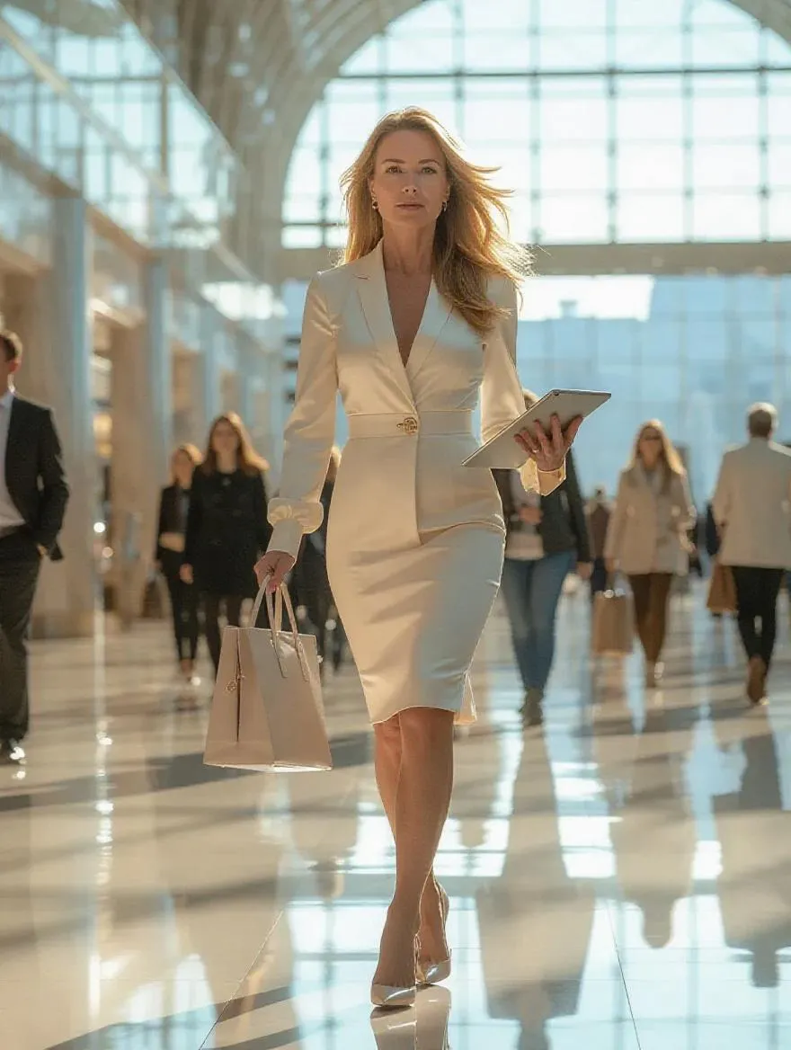 AI-generated visuals capture a poised German entrepreneur in a sleek ivory silk blouse, tailored pencil skirt, and nude heels striding through a bustling airport. Golden light and motion blur highlight her confident urgency, embodying power and elegance with professional-grade AI image effects for dynamic, cinematic scenes.