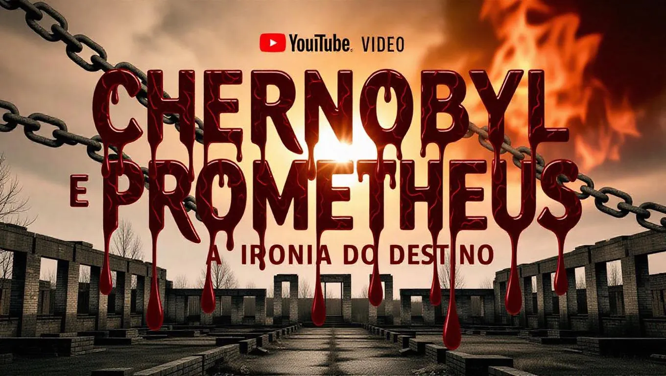 Create a dystopian YouTube thumbnail with molten iron text "Chernobyl e Prometheus: A Ironia do Destino" glowing red-hot against a cracked, ashen backdrop. Blend radioactive ruins, fiery accents, and metallic drips for eerie contrast, merging Chernobyl's decay with Prometheus' flame. Use dark metallics, burnt textures, and ominous shadows to evoke fate's twisted irony.