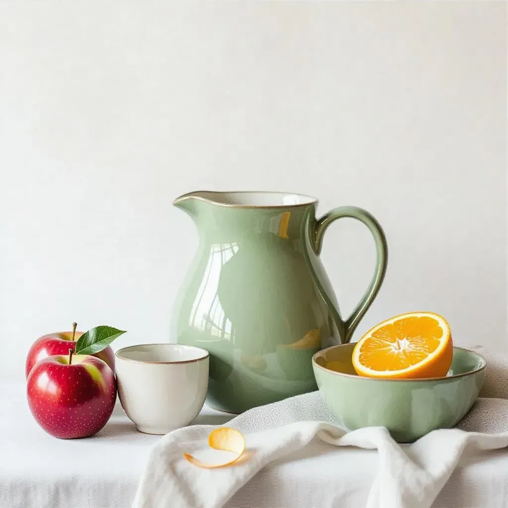 Create a serene still life with AI image generation. Transform prompts into minimalist compositions featuring ceramic pitchers, vibrant apples, and citrus accents. Achieve realistic textures, film grain effects, and balanced front-view layouts using professional AI tools for clean, fresh visual storytelling in your photography projects.