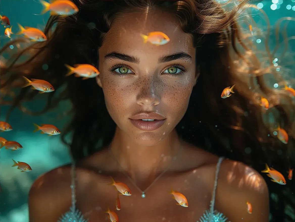 Sensual, beautiful mermaid in the deep sea, long flowing hair cascading through the water, mesmerizing green eyes, surrounded by bioluminescent fish and coral, captured in a stunning underwater photography moment, with a soft, ethereal glow.