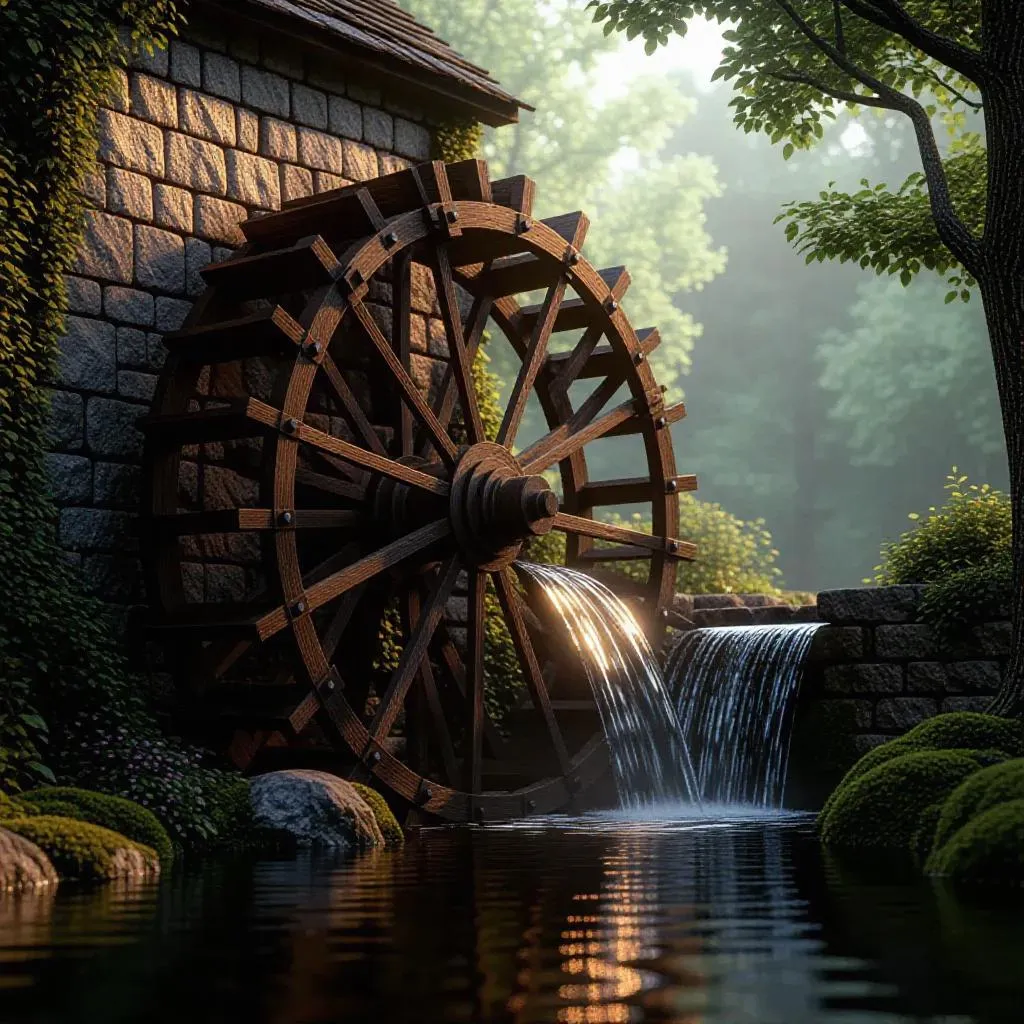 A majestic traditional water wheel with sharply defined curved paddles slowly turns near an ancient stone mill, partially overgrown with massive oak. The wheel, crafted from weathered wood and wrought iron, is entwined with vines and flowering moss, bathed in the soft mist of a cascading waterfall. Each rotation sends shimmering ripples of golden and emerald light into the forest stream, as if cleansing the natural world. The scene is rich with natural textures: moss, bark, stone, flowing water. Fantastic realism, hyper-detailing, cinematic lighting, volumetric fog, lush forest palette.