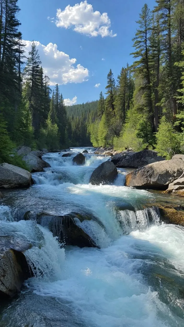 Capture the raw power of a roaring river with AI-generated nature scenes. Vivid currents cascade over jagged rocks under a bright sky, framed by lush forests swaying in mountain breezes. Create dramatic waterfalls, wilderness landscapes, and challenging rapids through AI video generation and 4K visual effects.