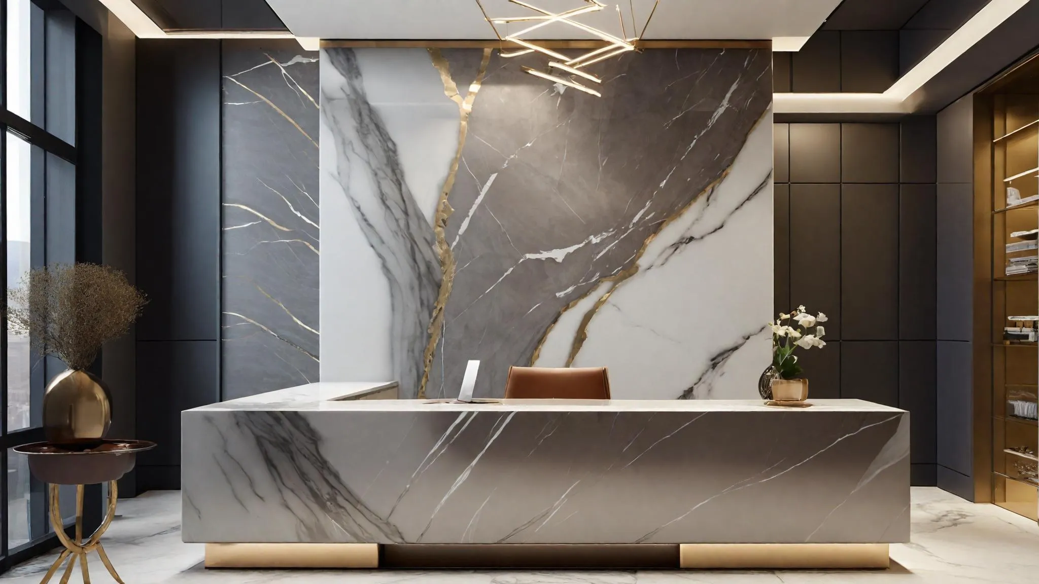 Discover a luxurious modern office design accentuating natural marble elegance. Featuring a polished marble desk with white-gray hues, golden veins, and marble-clad walls. Soft lighting highlights intricate details, complemented by minimalist decor, sleek chairs, and marble/wooden floors for a sophisticated, opulent workspace blending contemporary aesthetics with timeless marble beauty.