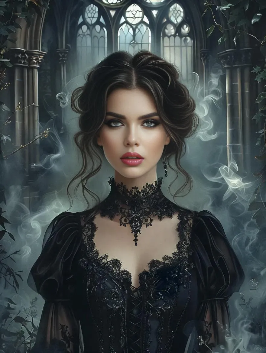 Generate a striking black and white fantasy portrait with vivago.ai's AI tools. Craft ethereal women in gothic aesthetics, blending smoky atmospheres, dramatic lighting, and intricate details. Achieve haunting beauty with high contrast, delicate features, and mystical auras. Ideal for dark fashion, surreal backdrops, and painterly styles—transform prompts into moody, dreamy visuals effortlessly.