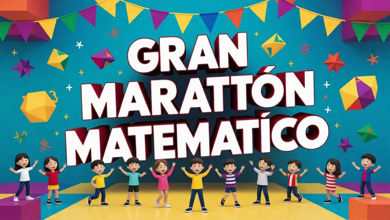 Generate a vibrant "Gran Maratón Matemático" Spanish-themed image with animated math symbols, geometric shapes, and playful student characters. Ideal for educational events, this AI-powered design blends lively fair aesthetics with dynamic animations, emphasizing bold text and excluding small letters for maximum visual impact.
