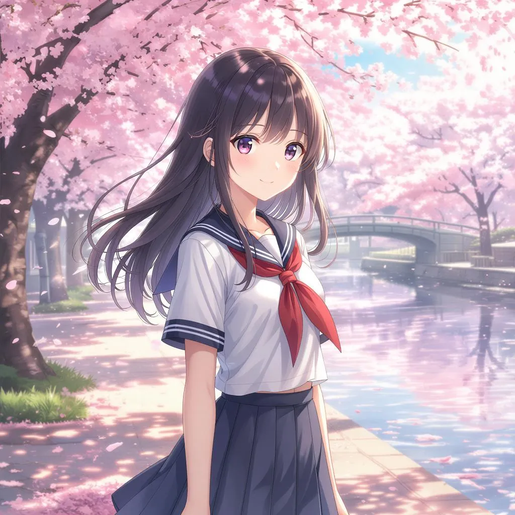 A beautiful anime girl standing by a quiet riverbank in spring, cherry blossoms falling around her. She wears a light school uniform with a soft breeze moving her hair. The background is detailed and softly lit, in the style of Kyoto Animation (KyoAni), with a warm and emotional color palette, subtle lighting, and refined character design. Highly detailed, cinematic composition, soft shading, vivid background, expressive anime eyes, delicate line art, Studio KyoAni style.