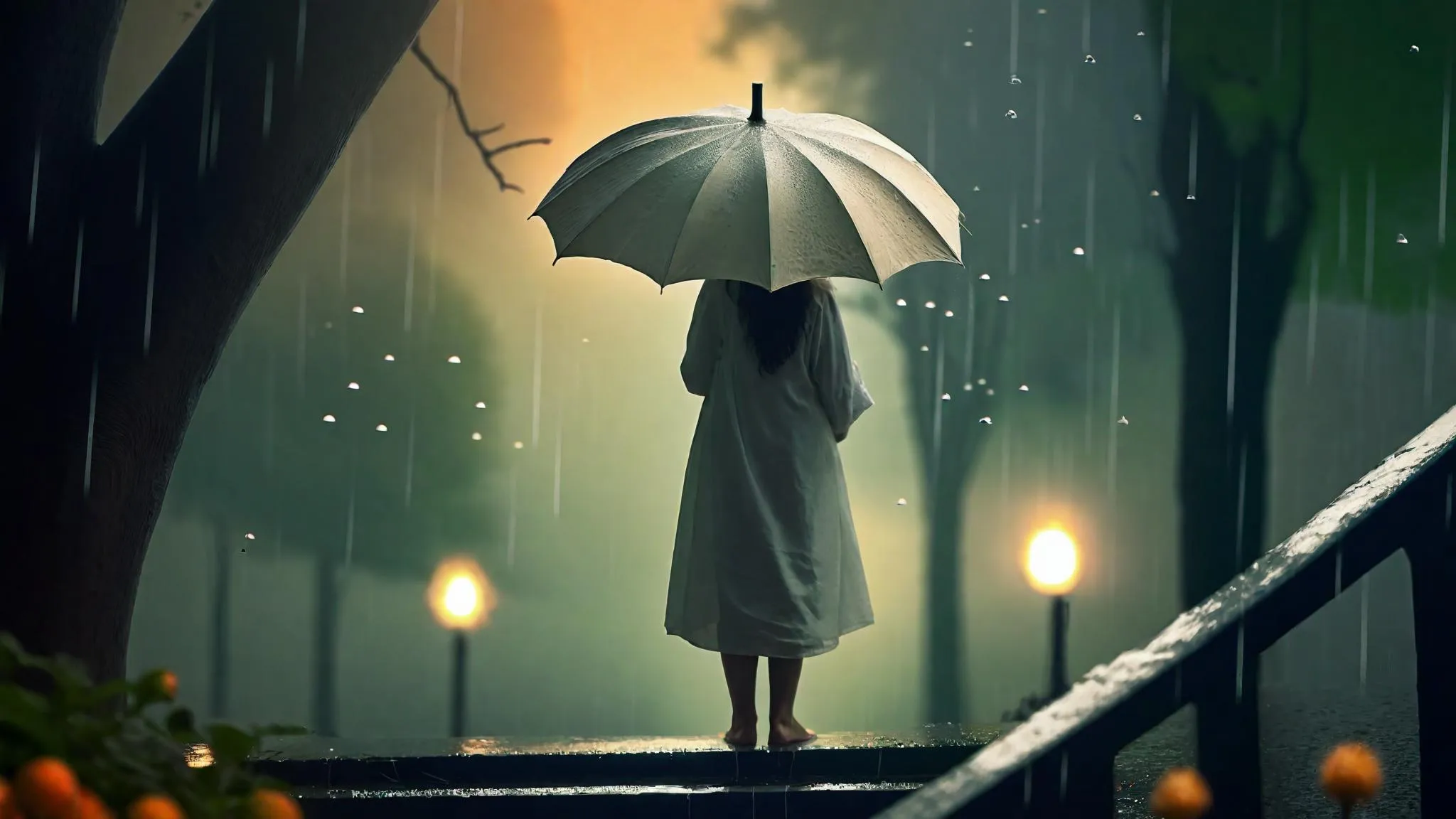 Generate AI visuals of a young girl in an Islamic dress holding a white umbrella amid rainy evening scenery. Realistic AI-generated nature scenes with lush trees, soft rain effects, and serene lighting for captivating, professional creative projects.