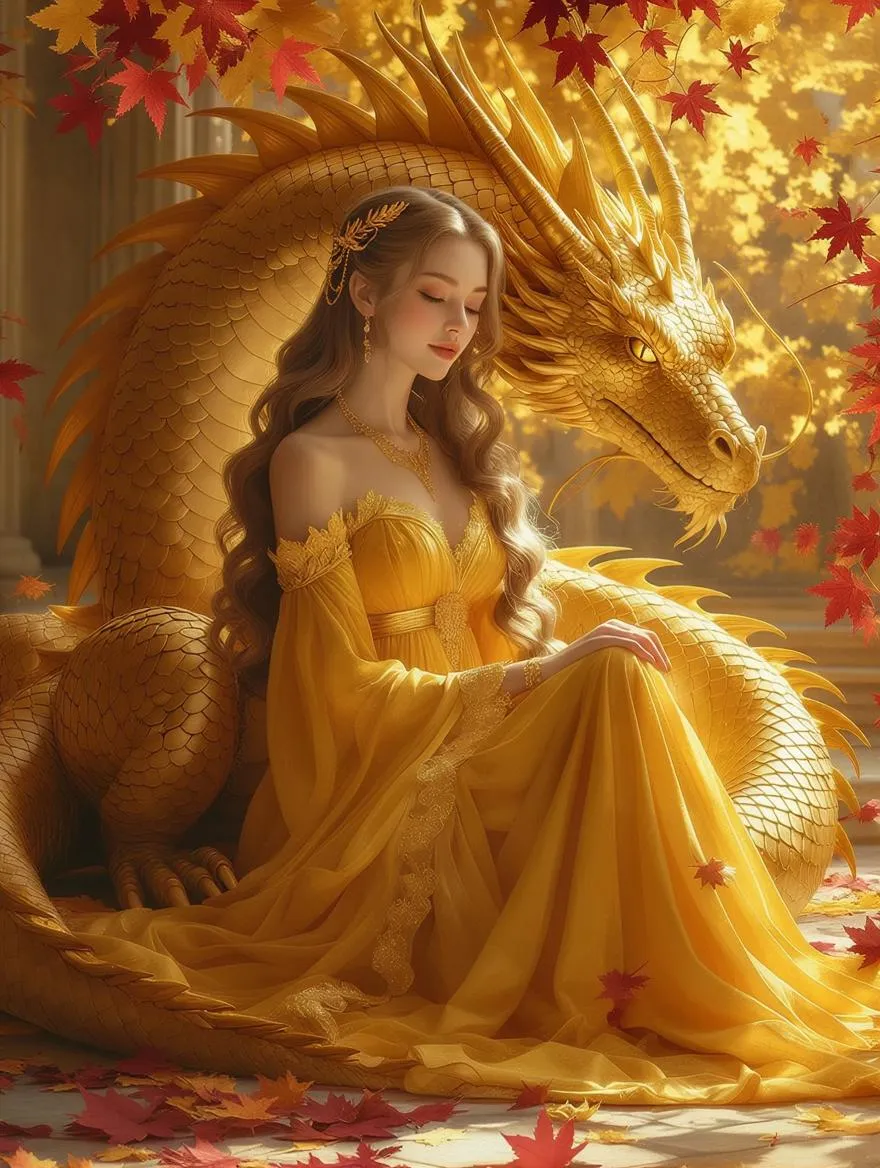 Generate stunning AI art of a fantasy empress, the queen of dragons, in a yellow dress beside her golden dragon. Vivago.ai's powerful AI image generator creates beautiful, autumnal fantasy portraits & epic goddess visuals from your text prompts. Craft professional-grade fantasy art with AI effects.