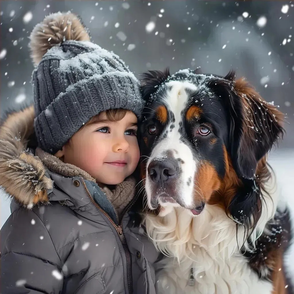 Create a heartwarming AI-generated winter scene of a child hugging a Saint Bernard in snow. Soft lighting, falling snowflakes, and muted tones highlight this tender outdoor moment. Perfect for cozy photography lovers. Craft emotional, intimate portraits with vivago.ai's AI image generator.