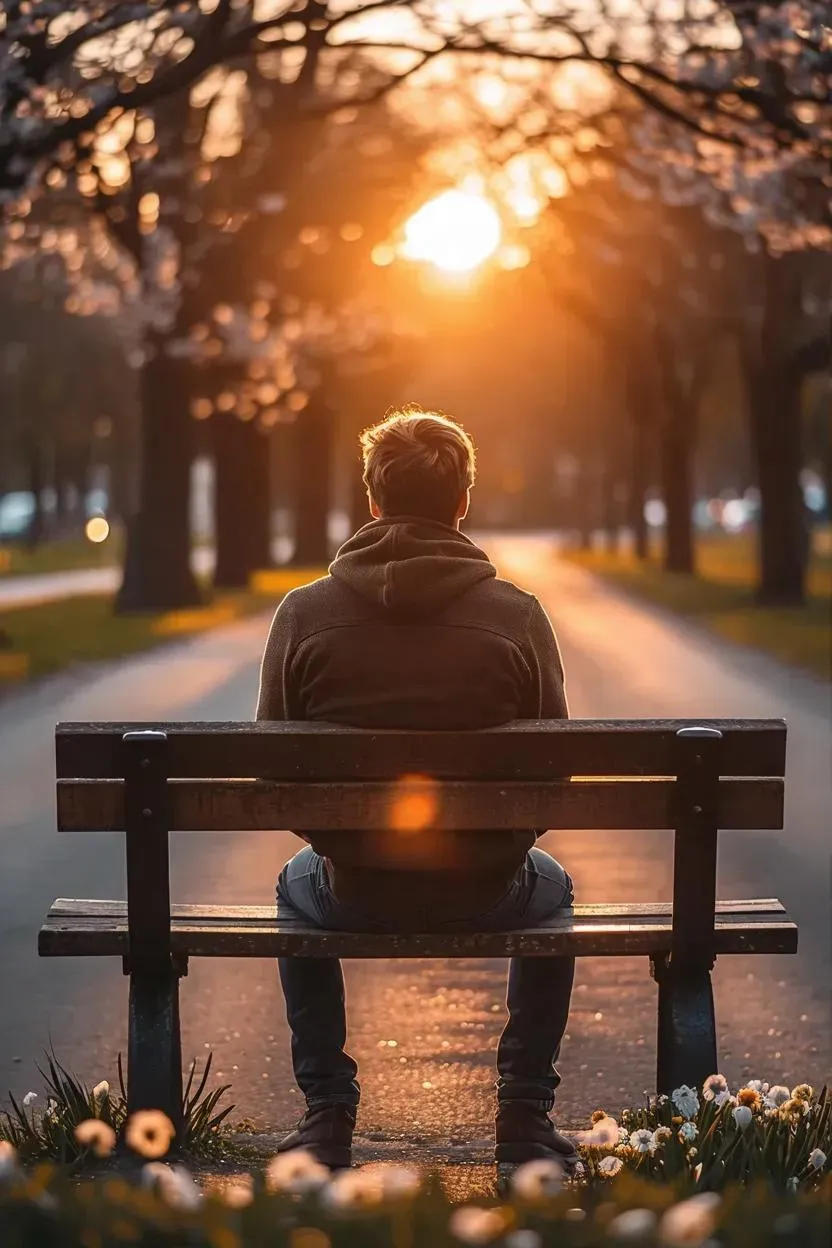 Powerful AI-generated book cover imagery depicting a resilient man overcoming heartbreak. Back turned, seated on a bench gazing at a sunrise-illuminated road symbolizing new beginnings. Professional-grade visuals convey strength, emotional healing, and hope for moving forward from breakups through advanced AI art generation tools.