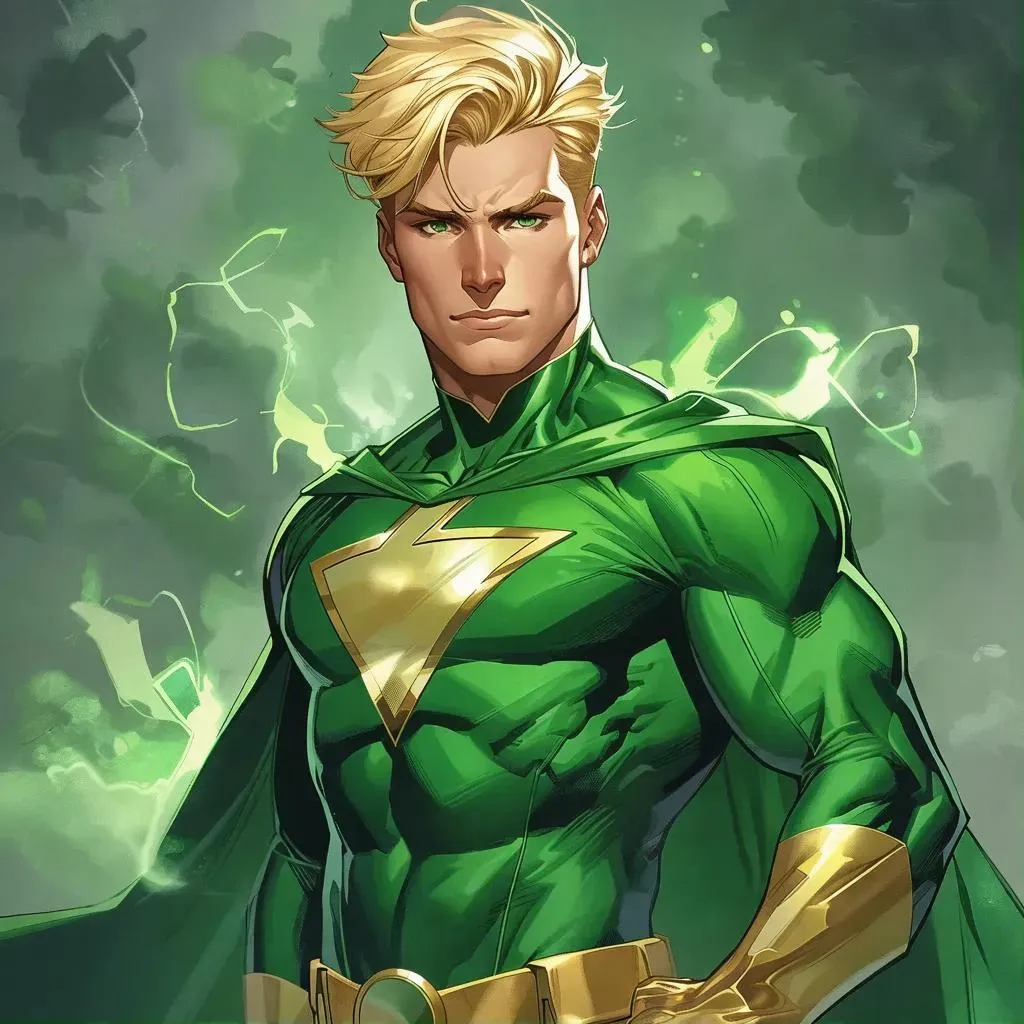 Generate a striking AI superhero portrait with luck-based powers. Featuring blonde hair, a bold green outfit, and dynamic visuals, this AI-crafted character design elevates comic art, fan creations, or storytelling projects. Optimized for SEO with vivago.ai's advanced image generation tools.