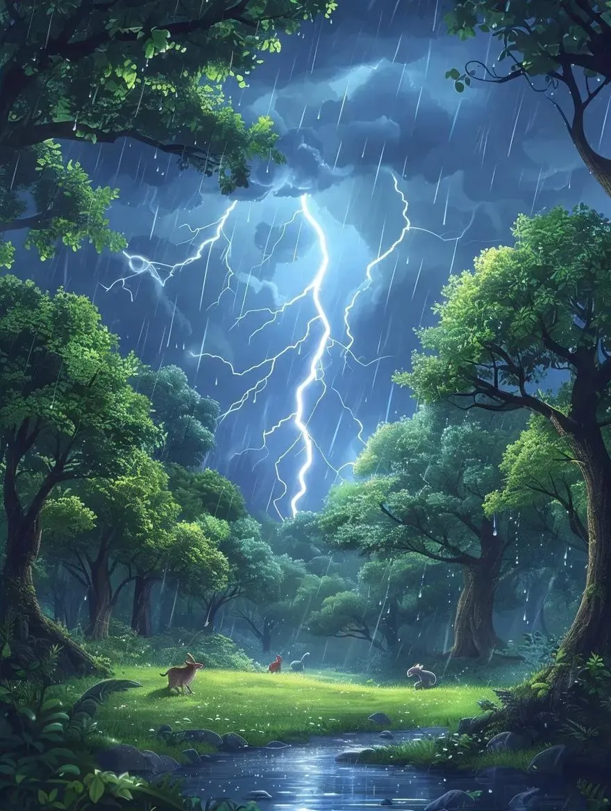 Create a playful cartoon forest rainstorm with AI. Generate vibrant animated scenes featuring bouncing raindrops, glowing foliage, and dynamic weather effects from text prompts. Ideal for children's books, animated shorts, or whimsical nature art. Customize storm intensity, color schemes, and character interactions through intuitive AI editing tools.