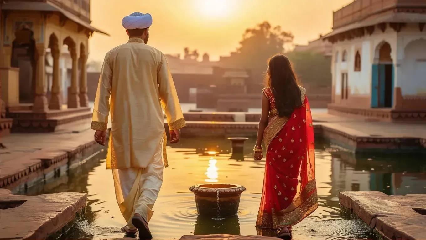 Generate lifelike urban sunset scenes with AI at Vivago.ai. Transform prompts into vivid visuals: a man in traditional Muslim attire walking near a well, a woman in a red saree beside him, bathed in golden sunset gradients. Perfect full-body realism for creative projects using advanced AI image tools.