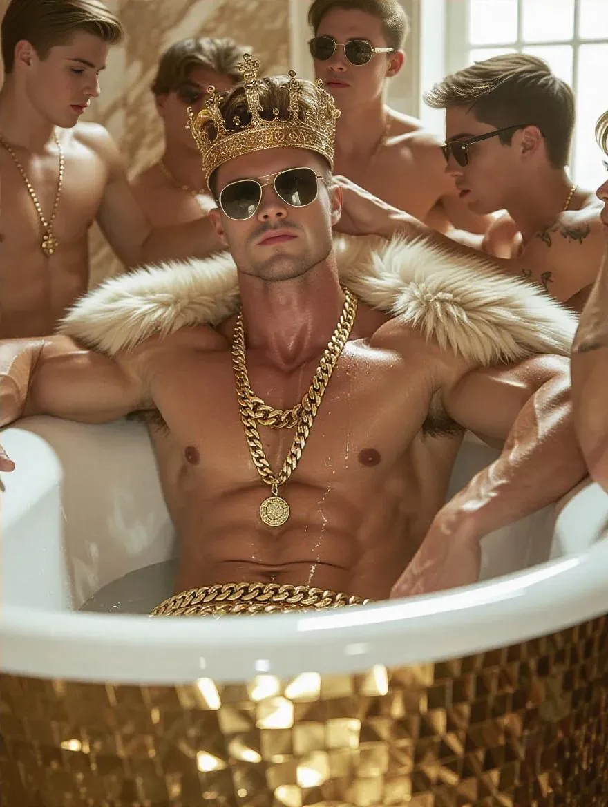 Generate AI-powered luxury fantasy visuals of a muscular king bathing in gold. Create opulent AI images featuring a shirtless bodybuilder monarch in a lavish bathtub, wearing a gold crown, chains, heavy fur cape, and sunglasses, surrounded by adoring attendants. Transform your prompt into this sensual, wide-view royalty scene with Vivago.ai's advanced image generation tools.