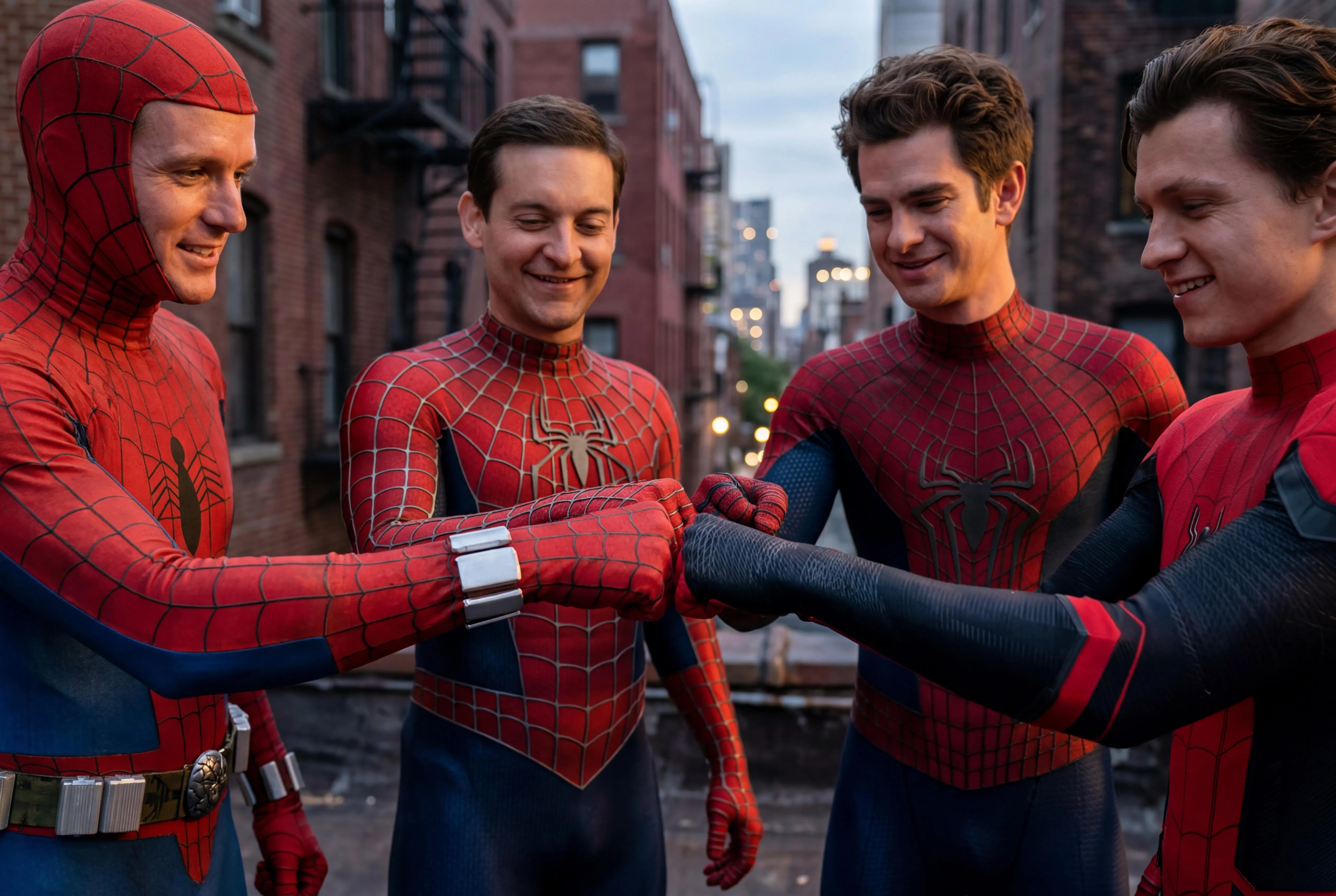 Spider-Man (portrayed by Nicholas Hammond, Tobey Maguire, Andrew Garfield, and Tom Holland) share a knuckle bump together.