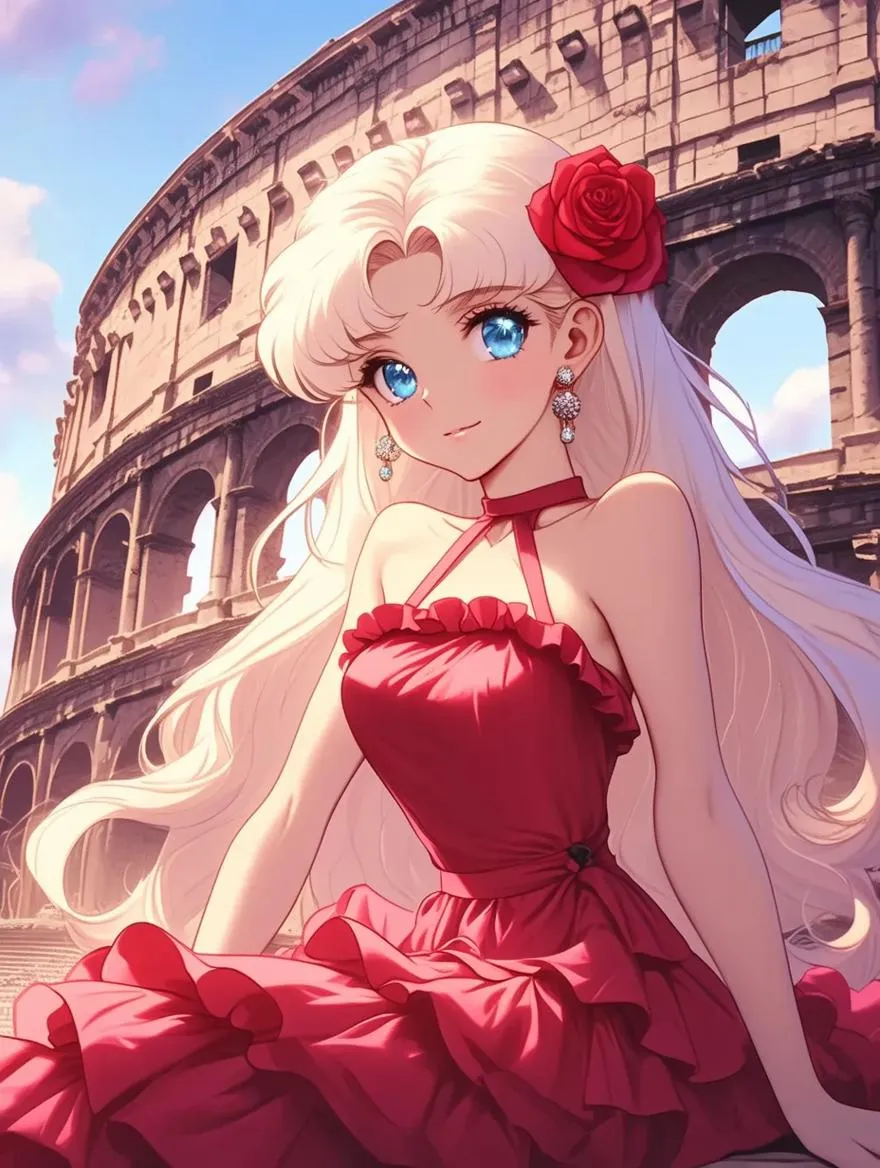 Step into 1980s shoujo manga with this AI-generated anime girl, blending retro manga aesthetics and a pink dreamscape. Featuring sparkling eyes, platinum blonde hair, and a vibrant red ruffled dress against the Roman Colosseum. Cinematic grainy texture, depth of field, and glowing retro lighting evoke nostalgic 80s anime covers with a pastel sky and aristocratic elegance. Ultra-detailed masterpiece.