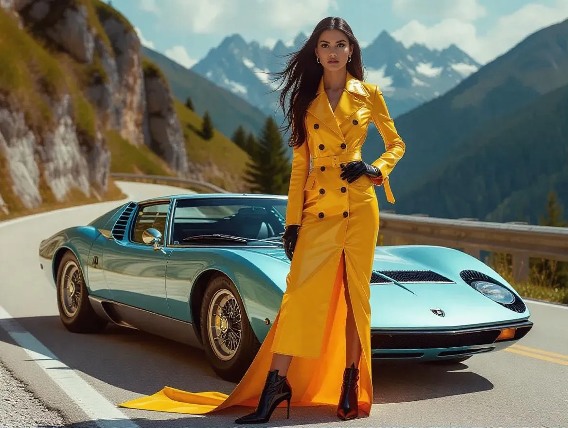 Transform your vision into stunning visuals with AI. Generate a chic Italian woman in a bright yellow PVC trench coat beside a vintage light blue Lamborghini Miura P400 on Italy's scenic mountain roads. Perfect for AI-powered image creation, blending fashion, luxury cars, and breathtaking landscapes with professional editing tools for striking, high-quality results.