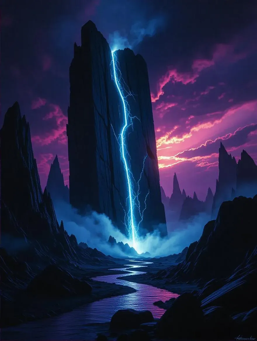 In a surreal landscape, a colossal dimensional crack spans the twilight sky, emitting an eerie, pulsating glow. The crack shimmers with otherworldly energy, warping the environment. The air brims with unease and intrigue. The art blends surrealism with cosmic elements, invoking awe and enigma.