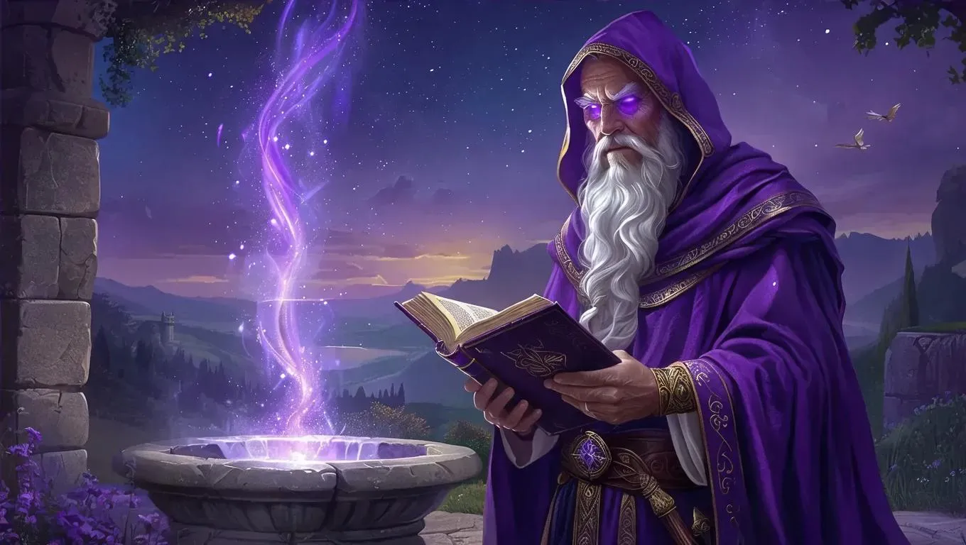 Create enchanting AI-generated art of a wise adventurer with a glowing purple cloak, mystical spellbook, and radiant purple eyes beside a luminous stone well. Craft vivid fantasy scenes using AI tools for spellbinding visuals, magical effects, and ethereal lighting. Perfect for mystical storytelling or character design with professional-grade AI artistry.