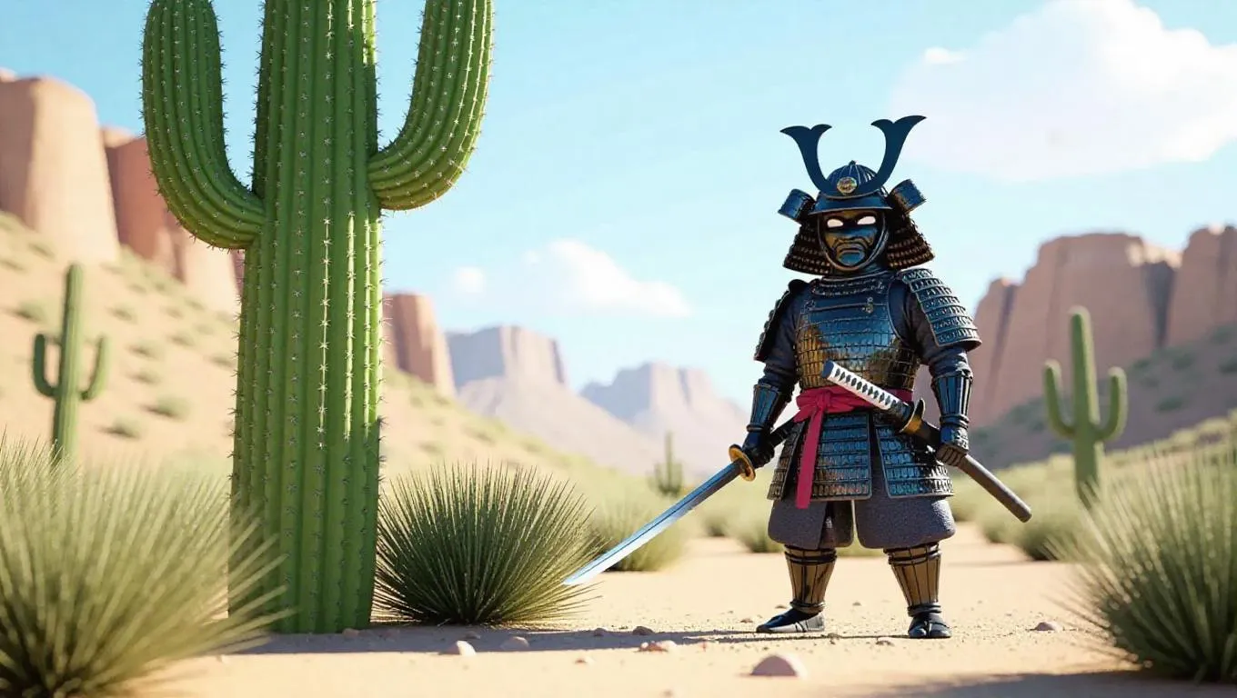 Create a vibrant PIXAR-style animation scene with AI: Mexican desert backdrop, detailed samurai in traditional armor wielding a katana beside a towering green cactus. Professional-grade AI tools for high-resolution, stylized visuals—ideal for dynamic storytelling or eye-catching content.