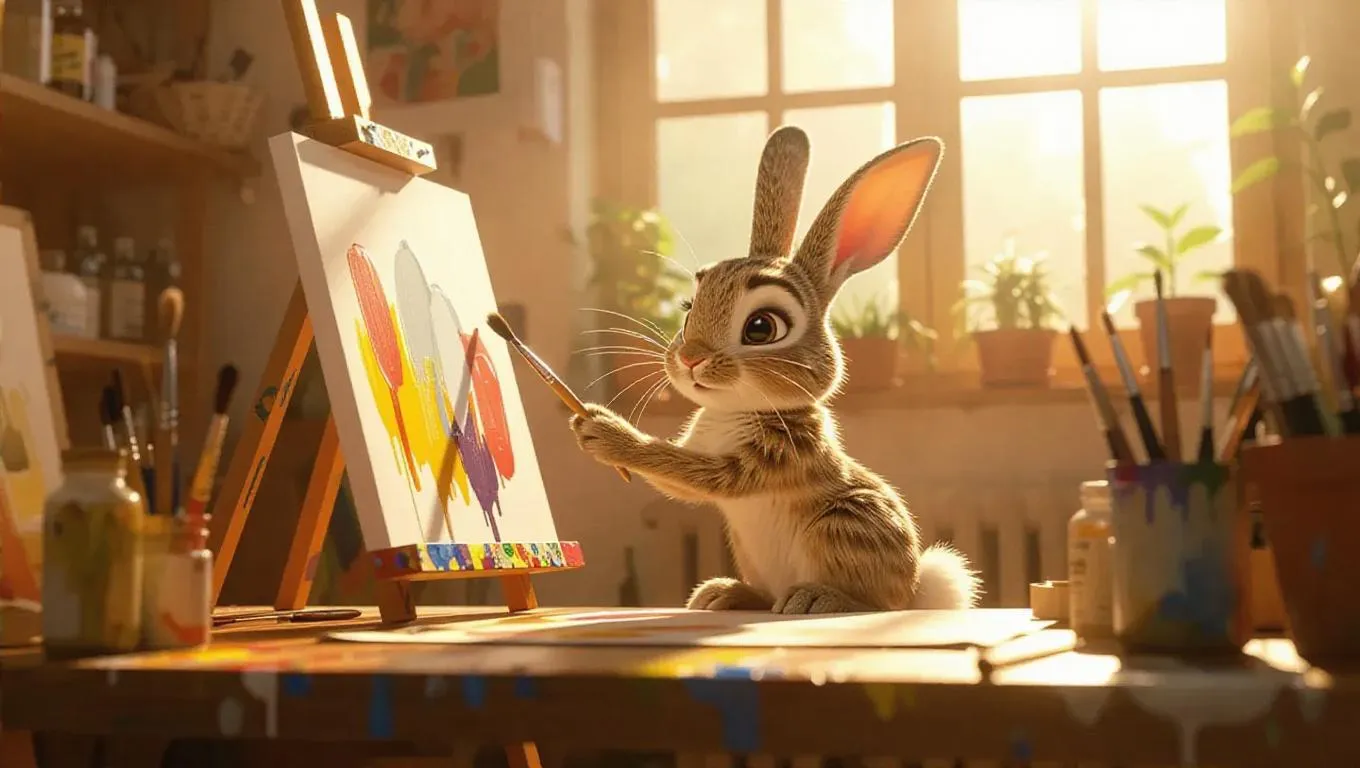 Create charming AI-generated art of an anthropomorphic rabbit painter in a sunny studio. This warm, whimsical illustration features a young female rabbit artist crafting vibrant designs with a paintbrush. Perfect for children's books, animations, or digital art projects. Experience fresh, creative AI image generation with VivaGo.ai's professional tools.